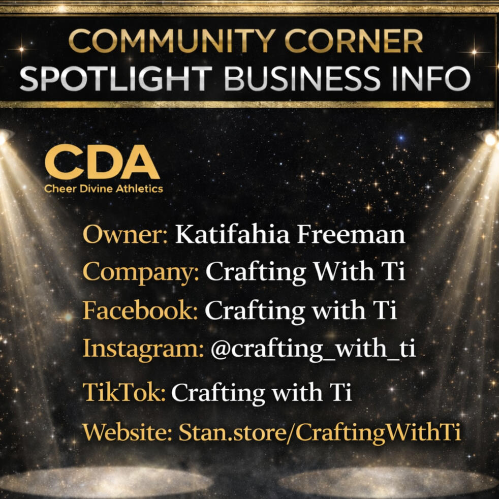 Welcome to Community Corner Spotlight — a platform created to intentionally shine a light on the incredible entrepreneurs and local businesses making an impact in our community.At Cheer Divine Athletics (CDA), we believe that when one business shines, we all shine. This series highlights the vision, passion, and purpose behind local brands while encouraging collaboration, support, and community growth.In each episode, our CDA Board Members sit down with local business owners to learn about their journey, their mission, and the services they provide. This service is ABSOLUTELY FREE. Each business gets posted for 1-2 weeks.Join us as we change the world — One athlete, One family, One community at a time.
