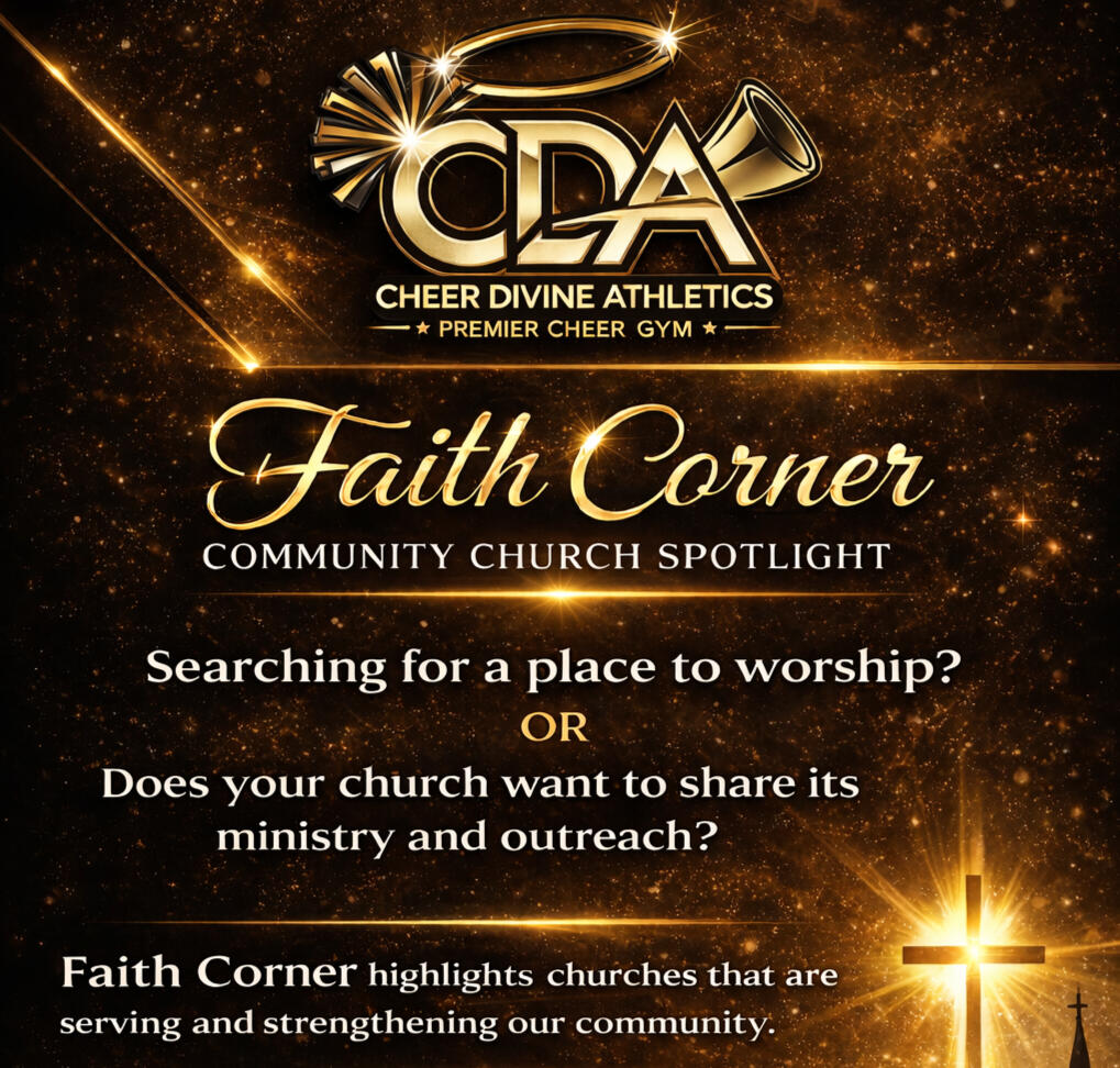 If your church would like to be featured in Faith Corner: Community Church Spotlight, we invite you to complete the CDA Faith Corner Form.Church leaders and ministry representatives can submit information about their church, upcoming events, outreach initiatives, and ways the community can get involved. This service is ABSOLUTELY FREE!Once your application is received, our team will review your submission and follow up with opportunities to highlight your church on the Cheer Divine Athletics website and community platforms.Together we can continue building a stronger community through faith, service, and collaboration.